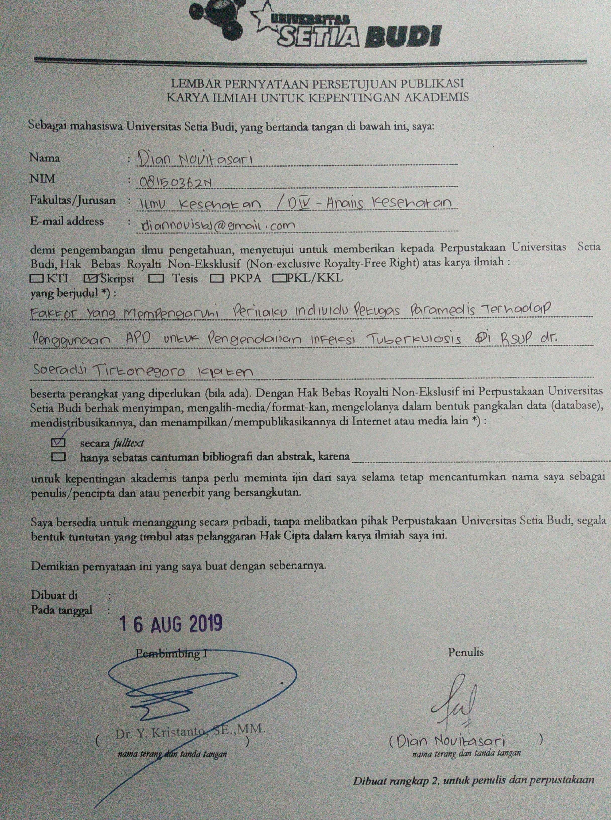 Novitasari, Dian (2019) FAKTOR YANG MEMPENGARUHI PERILAKU INDIVIDU PETUGAS PARAMEDIS TERHADAP PENGGUNAAN APD UNTUK PENGENDALIAN INFEKSI TUBERKULOSIS DI RSUP dr. SOERADJI TIRTONEGORO KLATEN. Skripsi thesis, Universitas Setia Budi.