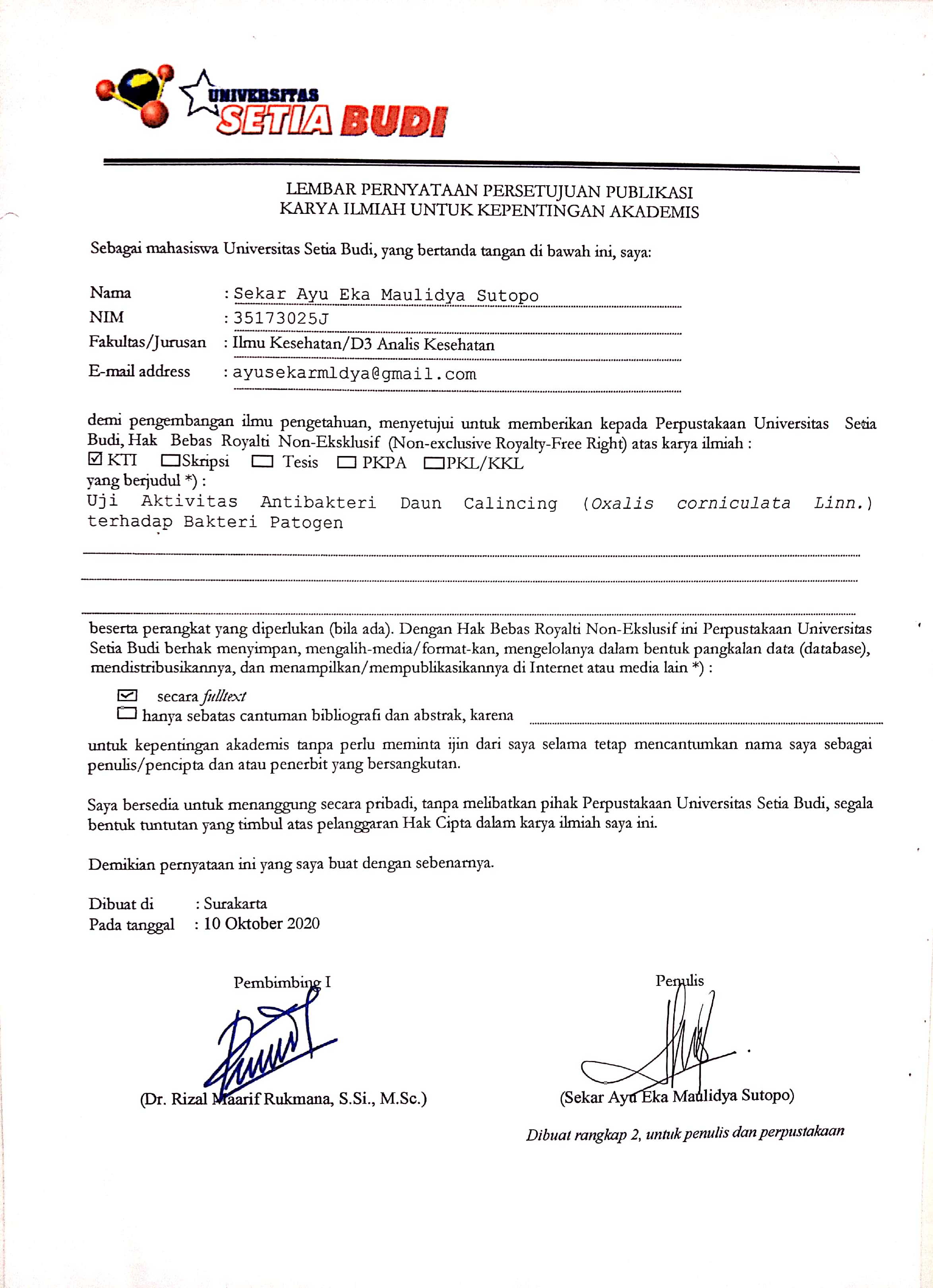 Sutopo, Sekar Ayu Eka Maulidya (2020) UJI AKTIVITAS ANTIBAKTERI DAUN CALINCING (Oxalis corniculata Linn.) TERHADAP BAKTERI PATOGEN. Karya Tulis Ilmiah thesis, Universitas Setia Budi Surakarta.